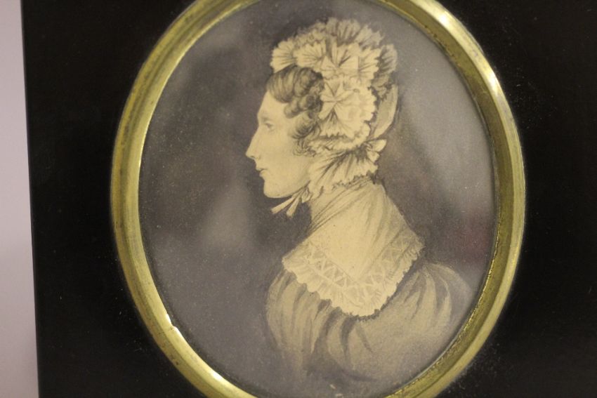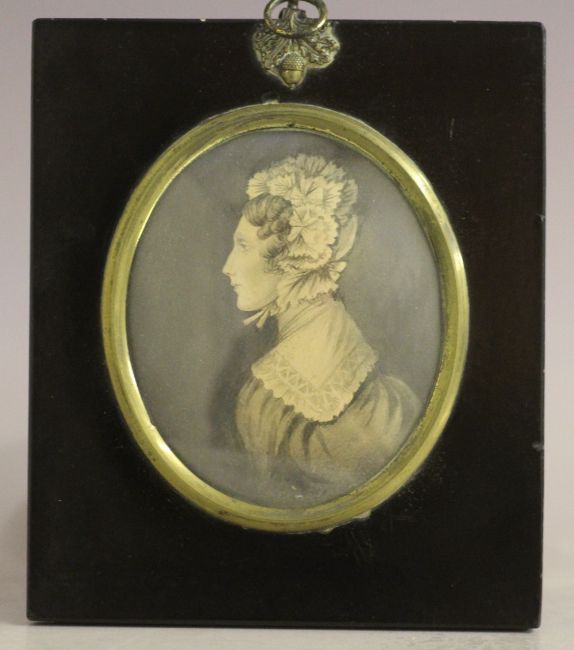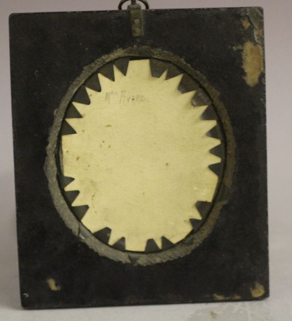 (XIX). Oval portrait miniature of Mrs Avaro, see verso, unsigned, watercolour on paper, framed and glazed, frame with acorn finial, 9 x 7 cm