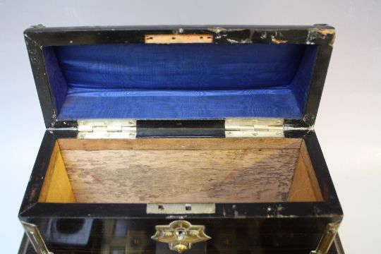 A 19TH CENTURY COROMANDEL STATIONARY DESK STAND WITH BRASS MOUNTS, the hinged lid compartment above two later glass inkwells, single drawer to the base, bearing white metal plaque, S/D