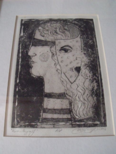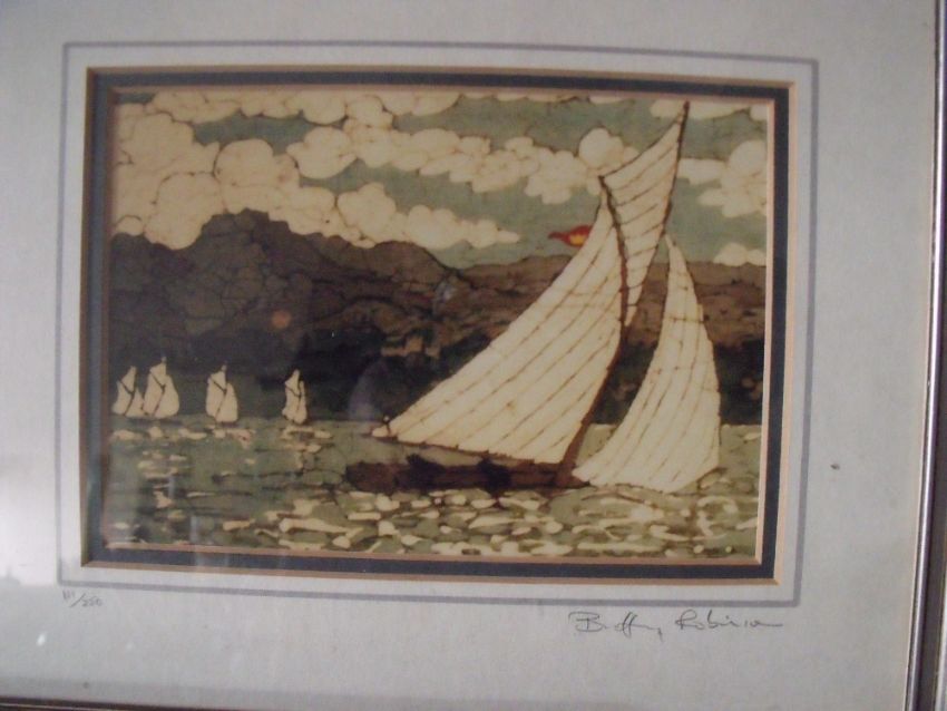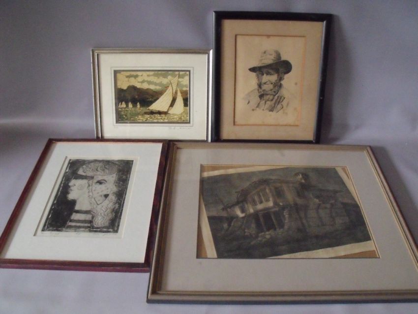 (XX). Three etchings and woodcuts etc., VISSAUV. Village building with figures, B ROBINSON. Lake scene with yachts and an abstract figure study, all signed lower right in pencil, all framed and glazed, together with W.L. Study of a bearded fisherman, signed and dated 1923 lower right, pen and ink on paper, framed and glazed, smallest 11 x 16 cm, largest 25 x 32 cm (4)