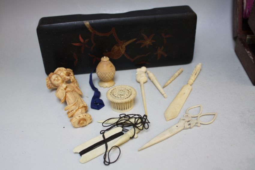 A COLLECTION OF ASSORTED LATE 19TH / EARLY 20TH CENTURY IVORY PIECES, to include a Japanese figure, sewing implements etc., in a lacquered box