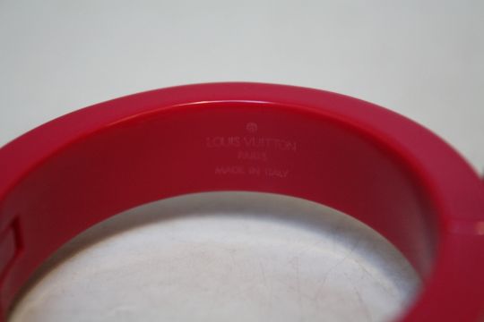 LOUIS VUITTON - A RESIN 'LOCK ME' HINGED BANGLE, with original box and Louis Vuitton drawstring bag