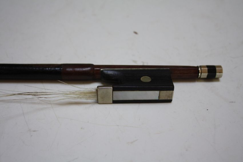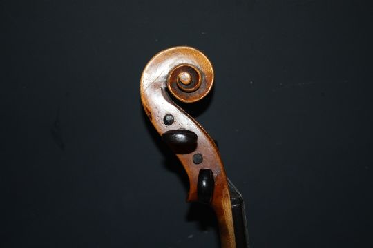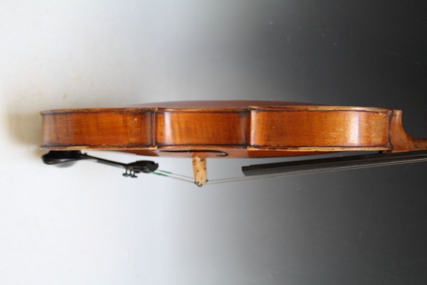 A VIOLIN AND BOW IN CROCODILE SKIN TYPE CASE, two piece back, L 59 cm