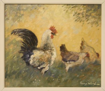 TERRY WARD (XX-XXI). Impressionist study of chickens in a meadow, signed lower right, oil on board, framed, 21 x 25 cm