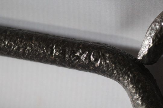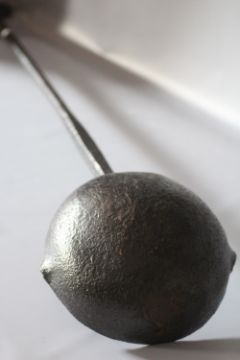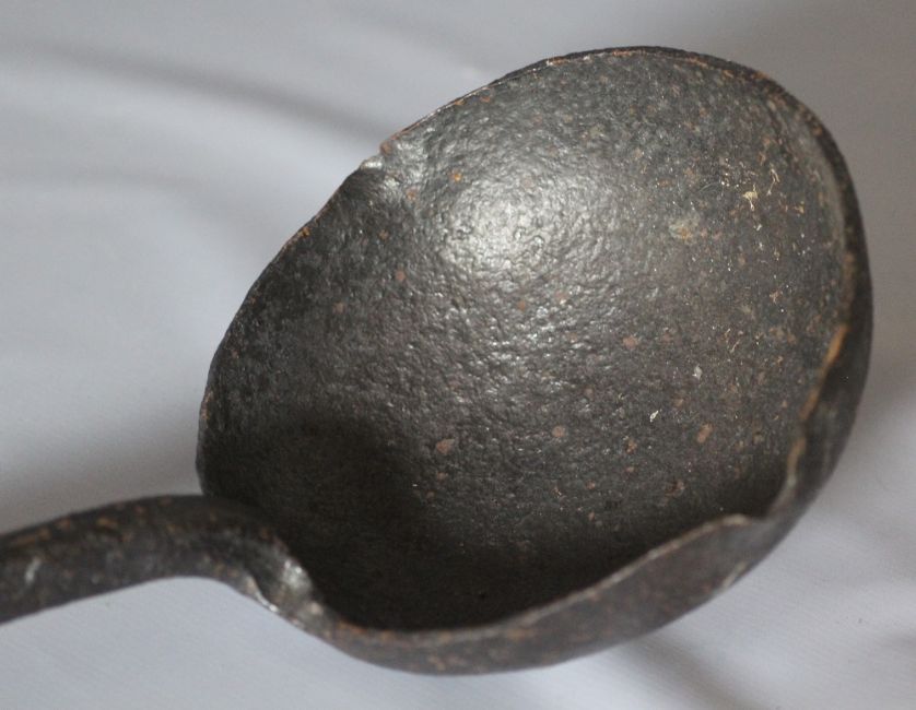 A LARGE CAST IRON LADLE, L 108 cm, together with a cast iron smelting pot, H 21 cm (2)