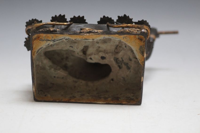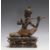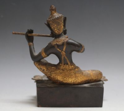A TIBETAN TYPE BRONZE FIGURE OF A DEITY PLAYING A FLUTE, sat upon a forest with deer being chased by a big cat, W 20 cm