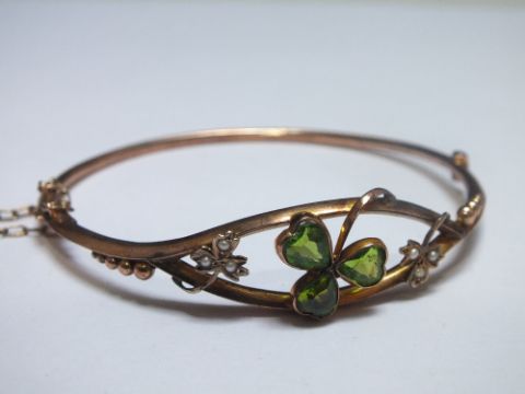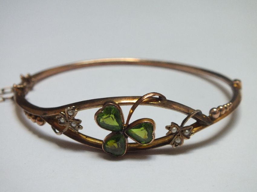 A 9CT GOLD SHAMROCK BANGLE, set with green peridot type stones with two further seed pearl set shamrocks, approx weight 5.2g, Dia 6.25 cm with a shaped fitted case.