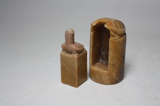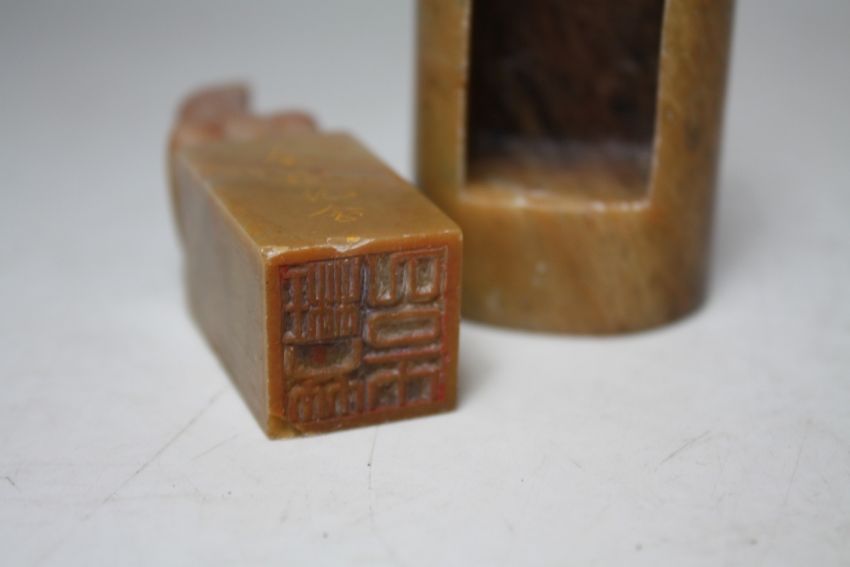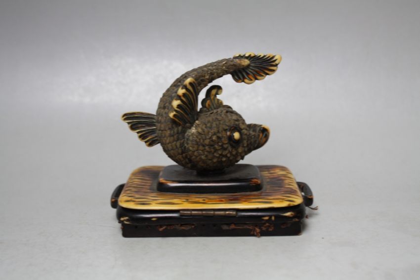 AN UNUSUAL CARVED 19TH CENTURY PUFFA STYLE FISH HELD ON A RECTANGULAR MOUNT, formerly a bag fastener, overall H 8.5 cm, together with a hardstone seal (2)