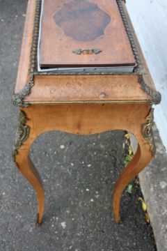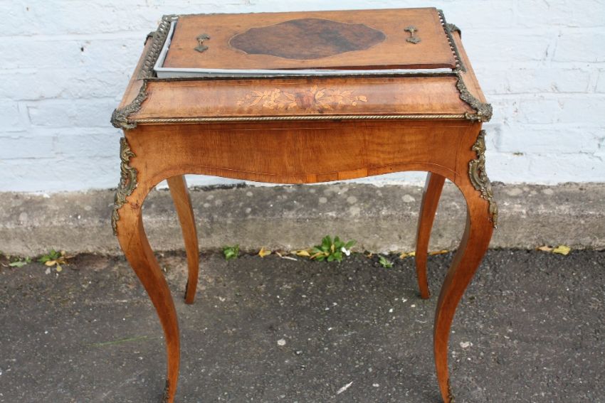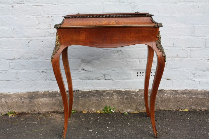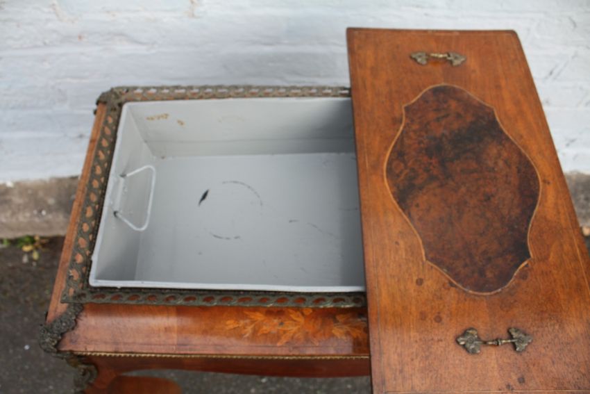 A FRENCH INLAID ANTIQUE WALNUT PLANT STAND JARDINIERE, having a twin handled cover over a later liner, inlaid floral detail, raised on shaped cabriole supports with gilt metal mounts, H 80 cm, W 70 cm