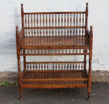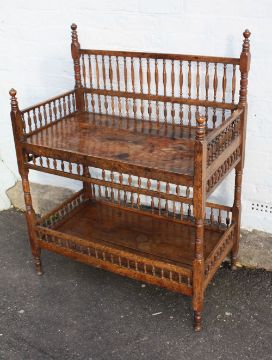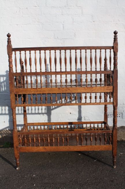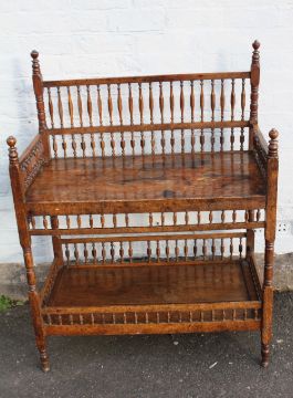 AN UNUSUAL ANTIQUE OAK BUFFET WITH TURNED SPINDLE DECORATION, of two tier construction with turned supports, H 122 cm, W 93 cm,. D 51 cm, S/D