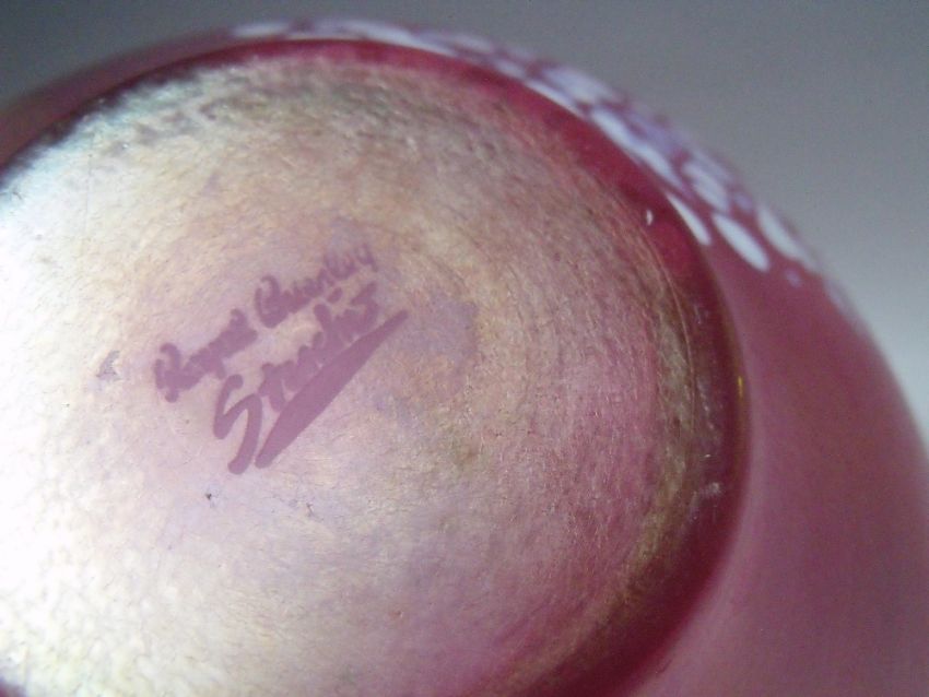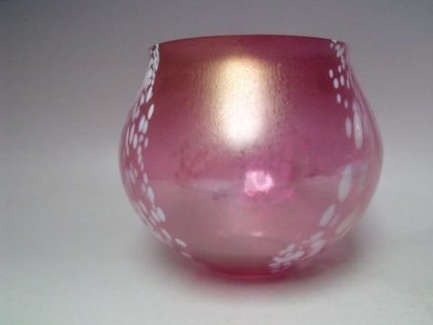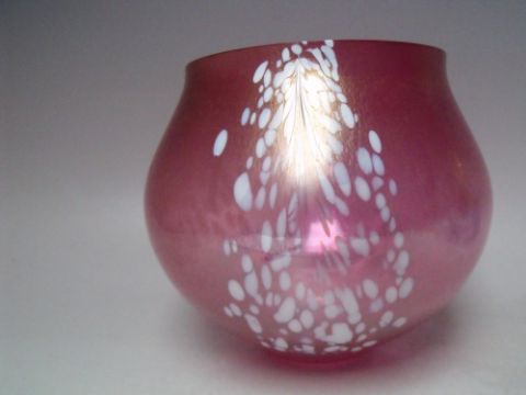 A ROYAL BRIERLEY STUDIO GLASS LUSTRE IRIDESCENT VASE, mottled pattern over ruby ground, original label, signed to base, H 16 cm, Dia. 18 cm