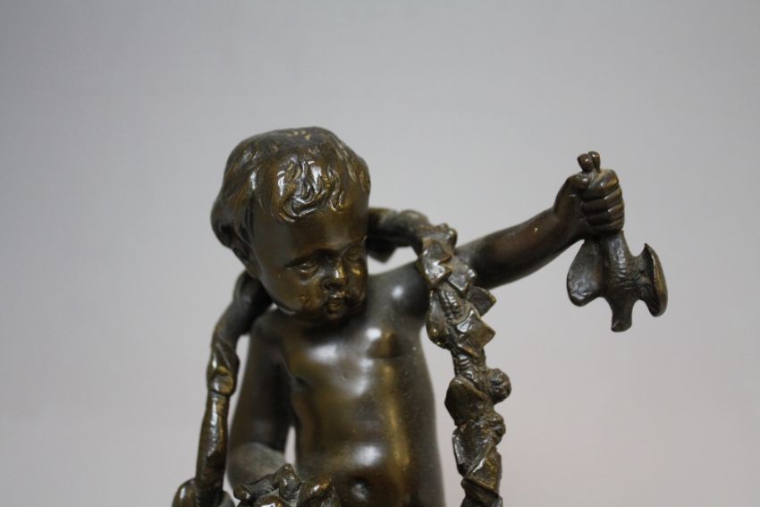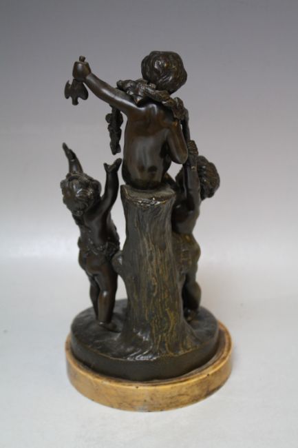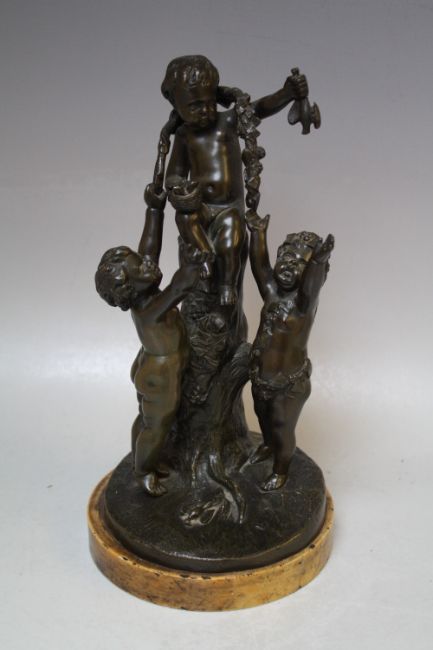 A 19TH CENTURY BRONZE FIGURATIVE STUDY OF THREE CHERUBS ON AND AROUND A TREE STUMP, raised on a circular marble base, unsigned, H 26 cm