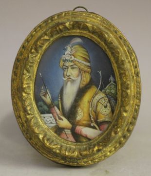 (XIX). Indian school, oval portrait miniature of a Sultan with bow and arrow, unsigned, mixed media on paper laid on card, framed and glazed, 8 x 6 cm, A/F
