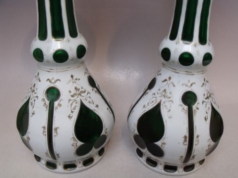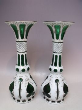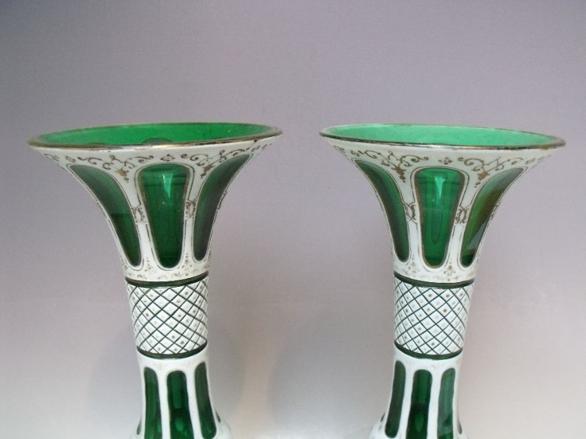 A PAIR OF BOHEMIAN GREEN GLASS AND WHITE ENAMEL OVERLAY VASES, with gilt decoration, H 32 cm