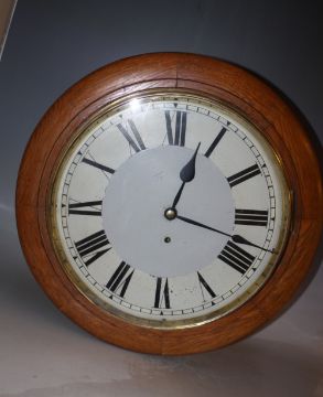 A 19TH CENTURY OAK CASED CIRCULAR WALLCLOCK, the enamel face with Roman numerals, Dia. 48 cm