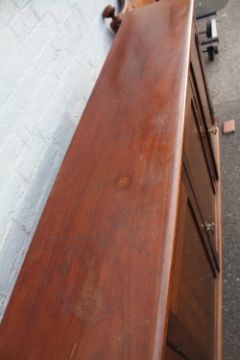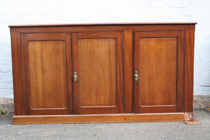 A 19TH CENTURY MAHOGANY SERVING SIDEBOARD, with three panelled doors, shelves to the interior, H 94 cm, W 173 cm, D 38.5 cm