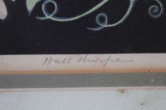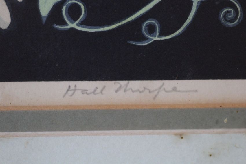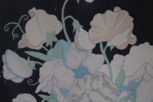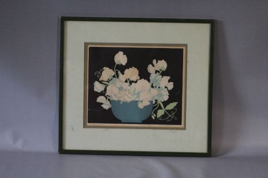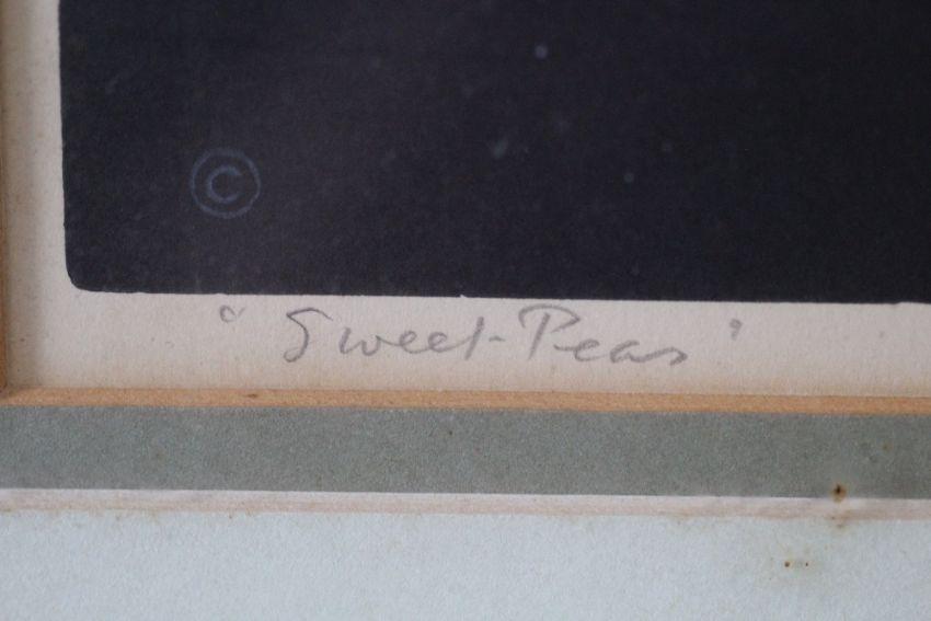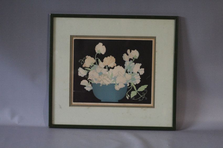JOHN HALL THORPE (1874-1947). Still life study of flowers in a bowl, 'Sweet Peas', signed in pencil lower right, coloured woodcut on paper, framed and glazed, 24 x 30 cm