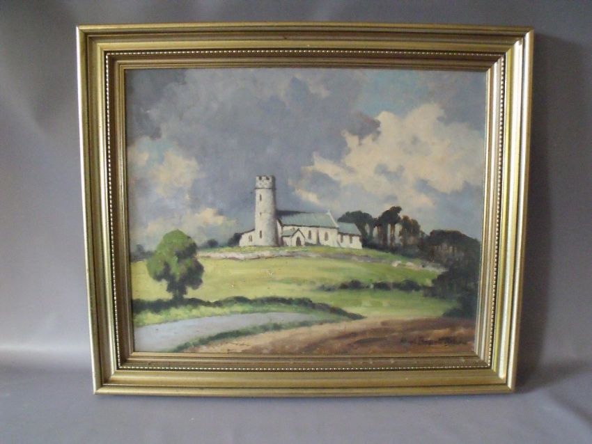 HUGH BOYCOTT BROWN (1909-1990). Modern British school, wooded landscape with church, signed lower right, oil on board, framed, 40 x 50 cm