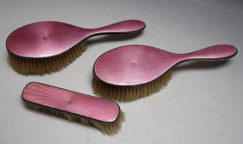 A HALLMARKED SILVER AND PINK GUILLOCHE ENAMEL DRESSING TABLE SET - BIRMINGHAM 1927, L 23 cm