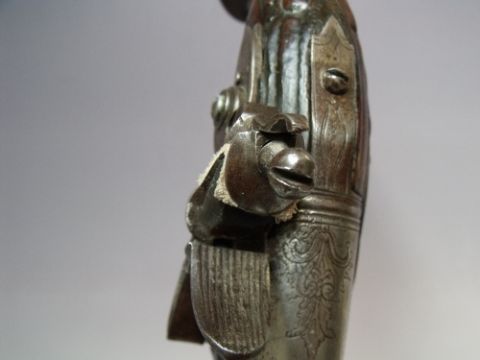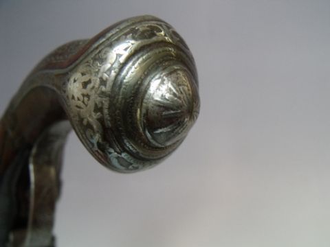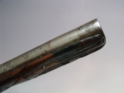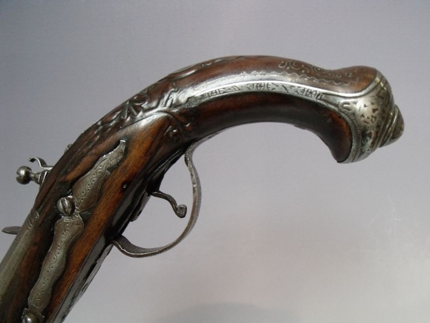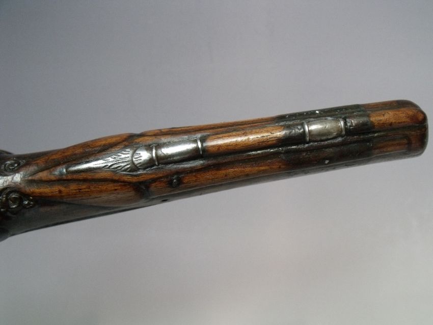 A LATE 18TH / EARLY 19TH CONTINENTAL FLINTLOCK PISTOL, possible Spanish / Portuguese, with inlaid white metal embellishments, L 33 cm