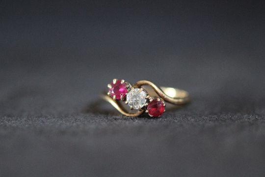 AN 18CT GOLD THREE STONE RUBY AND DIAMOND RING, approx weight 3.7g, ring size P 1/2