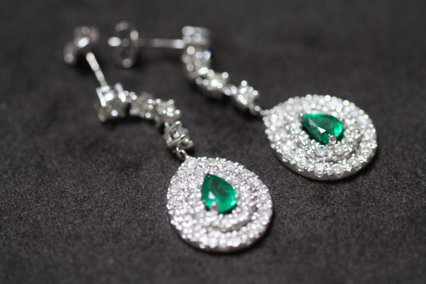 A PAIR OF 18ct WHITE GOLD PEAR DROP EMERALD AND DIAMOND CLUSTER DROP EARRINGS, boxed. Emeralds 1.71ct approx. Diamonds 3.25ct approx.