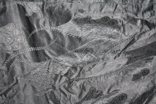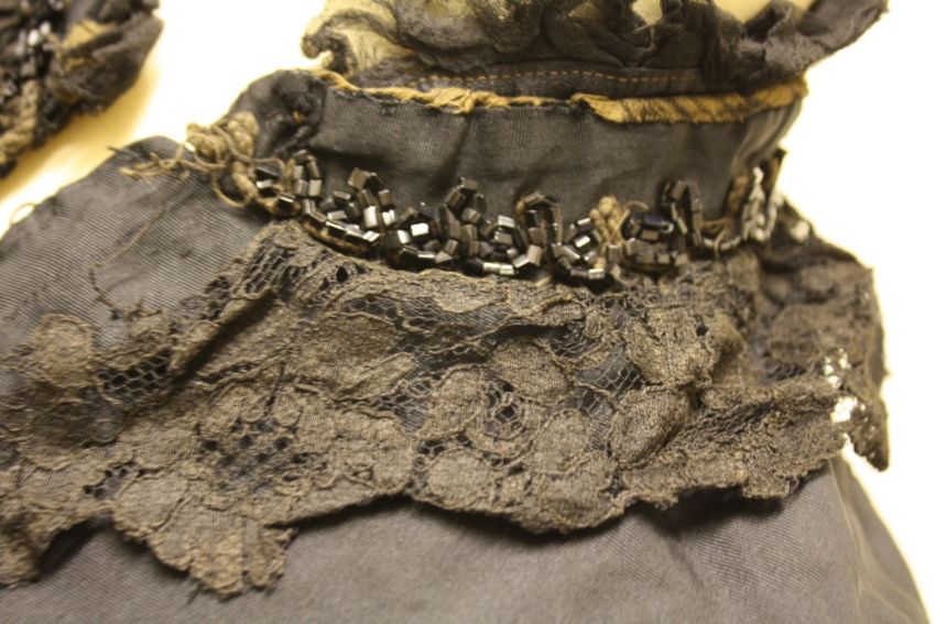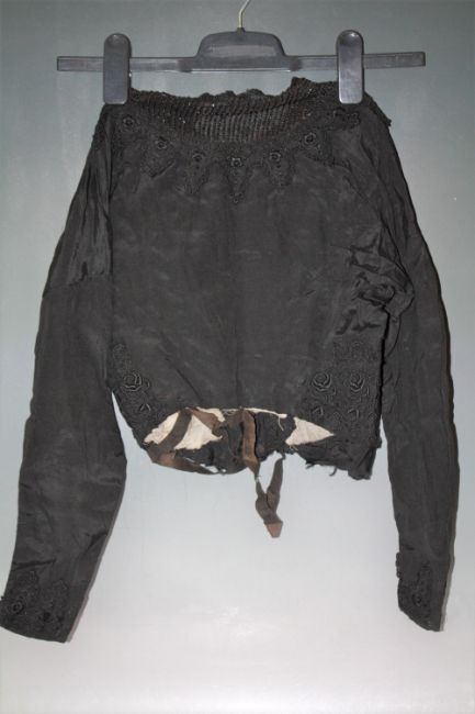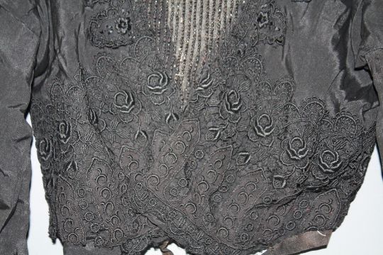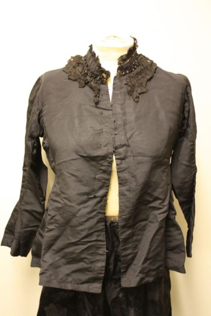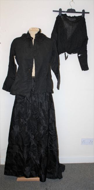 A SELECTION OF VICTORIAN CLOTHING, comprising a ladies blouse with jet bead detailing, a long sleeve jacket style top with lace and bead detail to collar and a long length skirt, fully lined with frilled effect to bottom edge of lining (3)