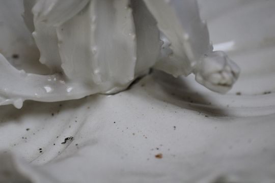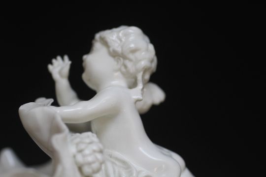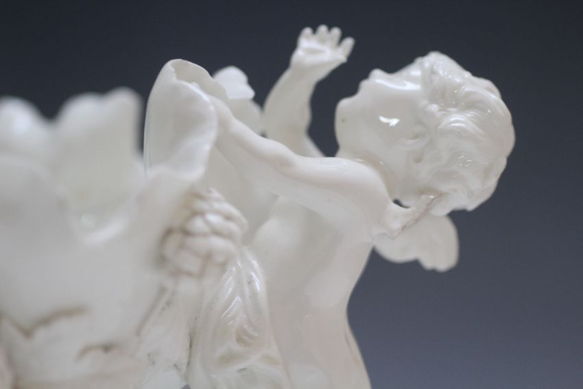 A MOORE BROTHERS TABLE COMPORT FEATURING CHERUBS AND HOPS DESIGN, A/F, W 38 cm, together with a white porcelain comport, makers mark indistinct, H 47 cm A/F