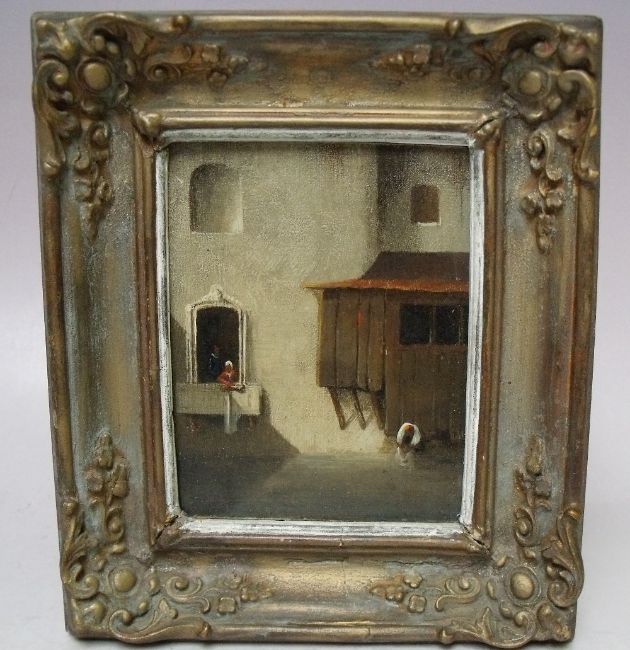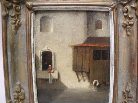 (XIX). Dutch school, street scene wit figure looking out of a window, unsigned, oil on copper, framed, 10 x 7 cm