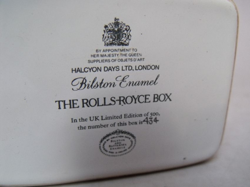 A LIMITED EDITION HALCYON DAYS ENAMEL 'THE ROLLS-ROYCE BOX', number 434 of 500
