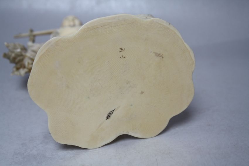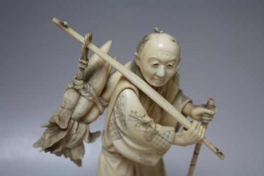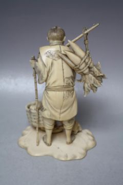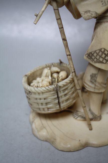 A JAPANESE IVORY OKIMONO, depicting a fruit seller holding a rod over his shoulder with his fruit / veg, the other hand holding a staff, a basket of fruit by his feet and a small dog, Meiji period, H 18 cm, S/D
