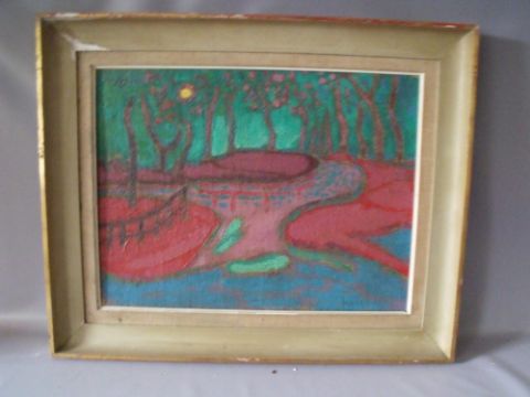 (XX). Moonlit wooded river landscape, indistinctly signed upper left, oil on board, framed, 42 x 56 cm