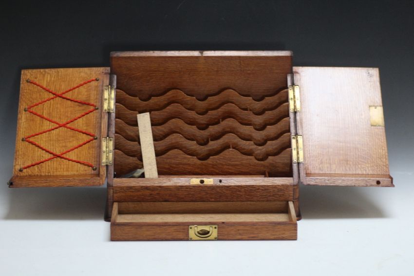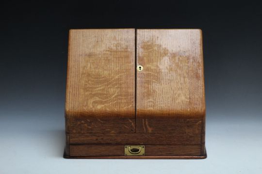AN OAK SLOPE FRONTED STATIONARY BOX, W 37 cm