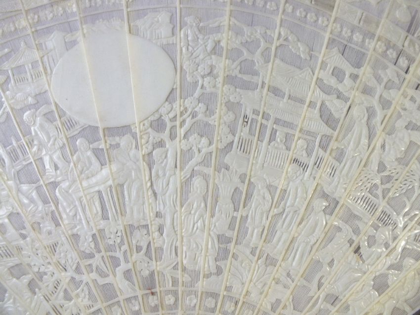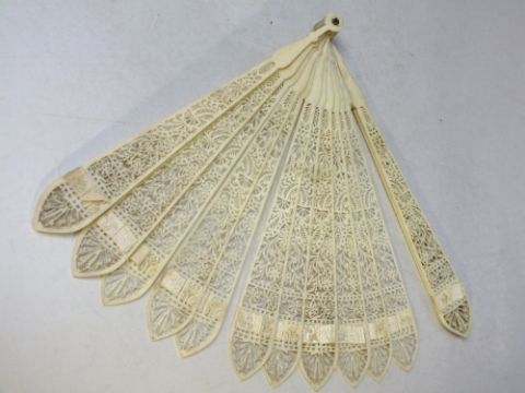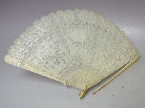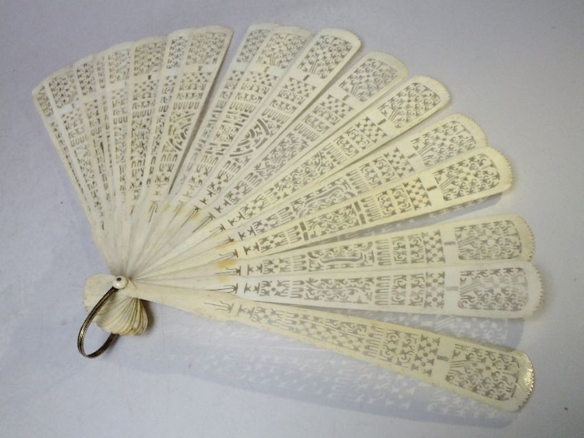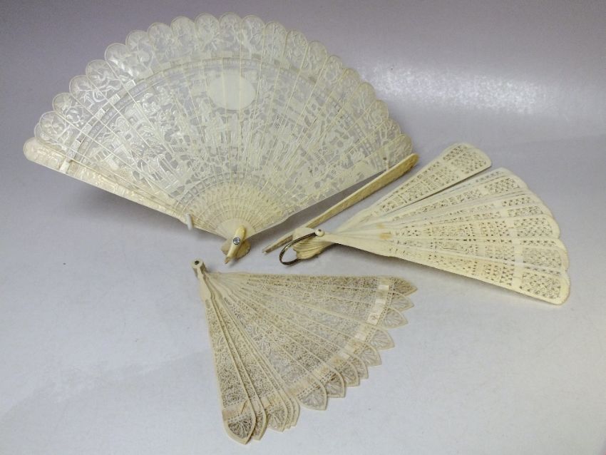 TWO BOXED ANTIQUE CARVED BONE / IVORY BRISE FANS FOR RESTORATION, together with an unboxed example (3)