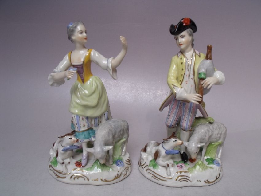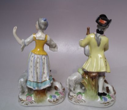 A PAIR OF CONTINENTAL CERAMIC FIGURES, with crossed sword backstamps, tallest H 16 cm
