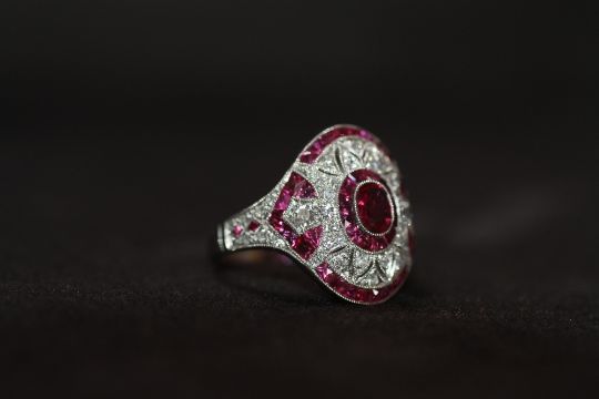 AN ORNATE PLATINUM RUBY AND DIAMOND DRESS RING, Set with an oval-cut ruby, calibre-cut rubies and RBC diamonds , Ring size N