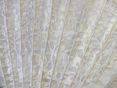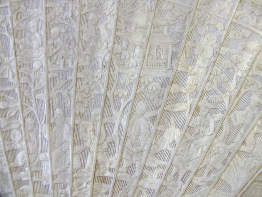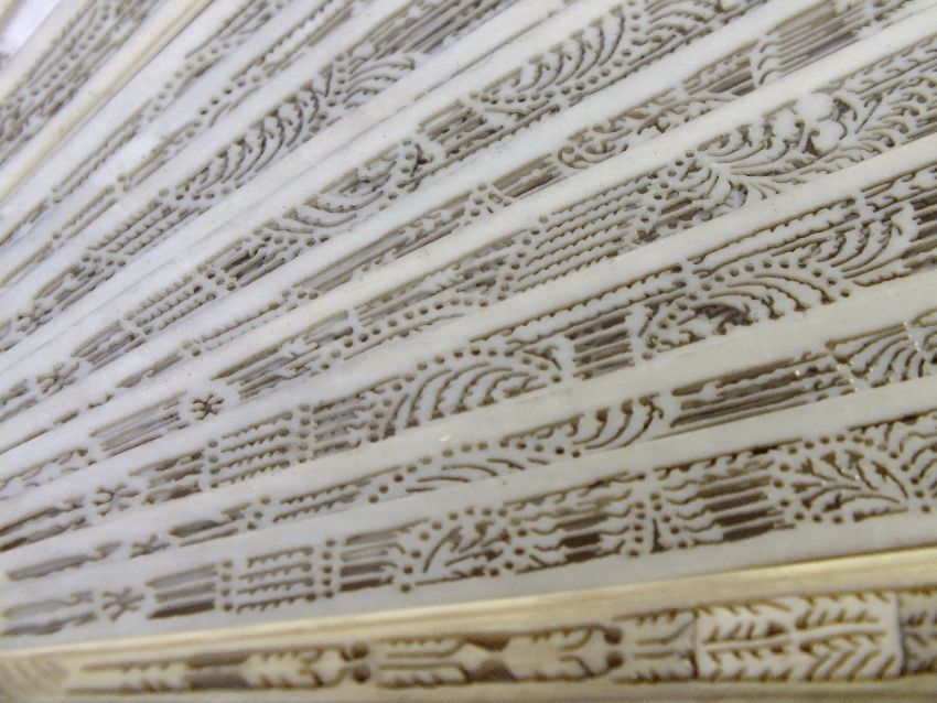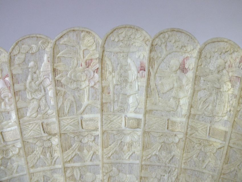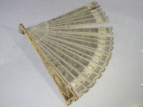 AN ANTIQUE CARVED BONE / IVORY BRISE FAN FOR RESTORATION, together with a smaller example, longest L 18.5 cm (2)