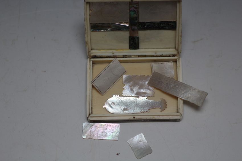 A CHINESE TYPE COUNTER BOX WITH MOTHER OF PEARL COUNTERS, W 8.5 cm