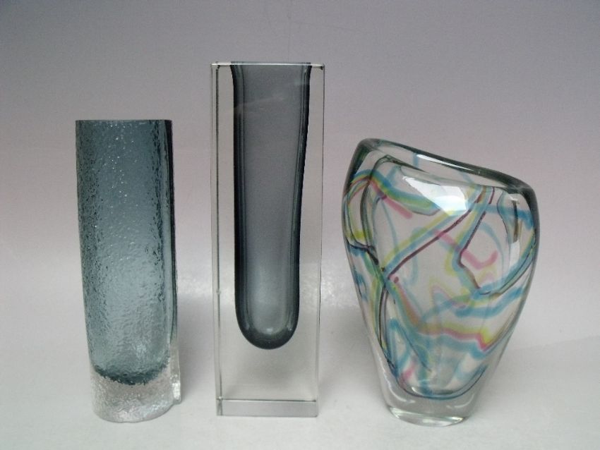 A RIIHIMAEN TEXTURED GLASS VASE BY TAMARA ALADIN, together with a Kalimar Glasbuk vase designed by Tora Pors -signed to base, H 17 cm, plus a third glass vase (3)