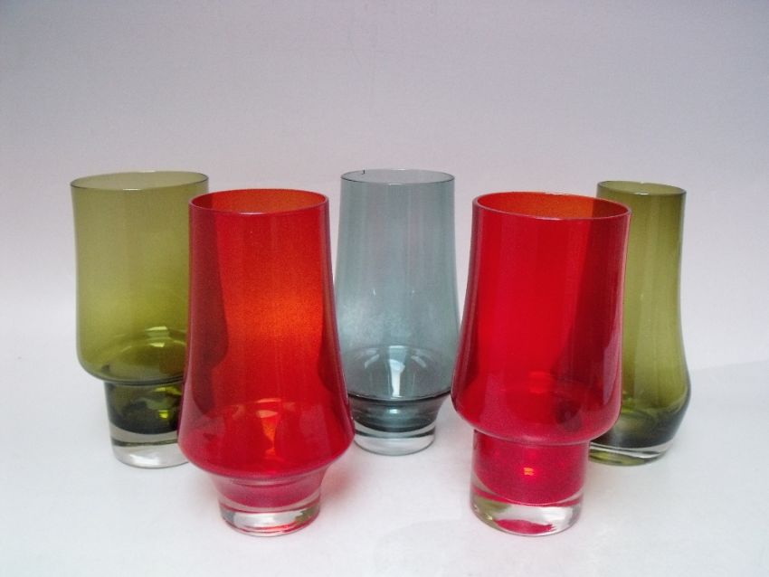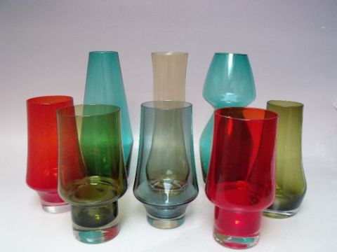 A GROUP OF EIGHT MAINLY FINNISH RIIHIMAKI STUDIO / ART GLASS VASES, varying shapes and colours, to include pattern numbers 1374 and 1479 etc., tallest H 25 cm (8)
