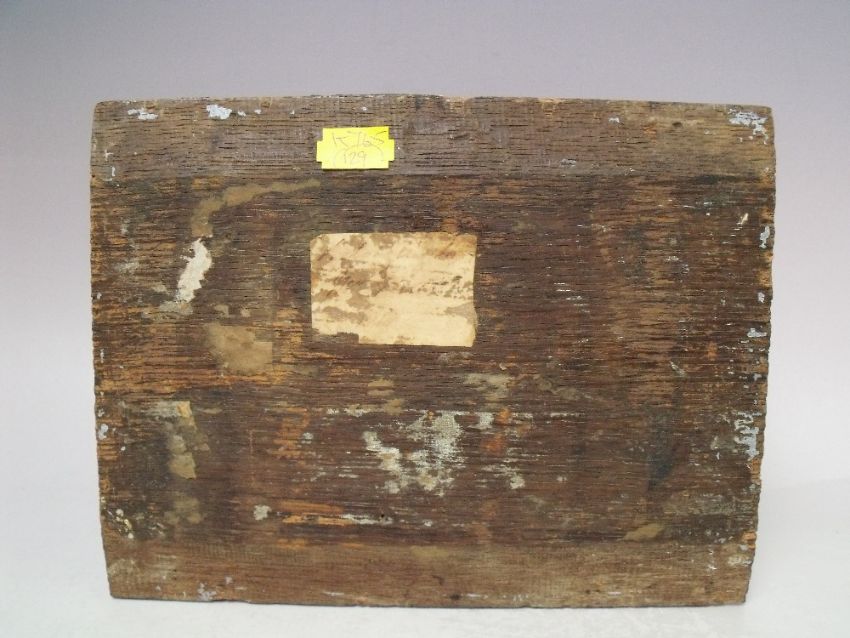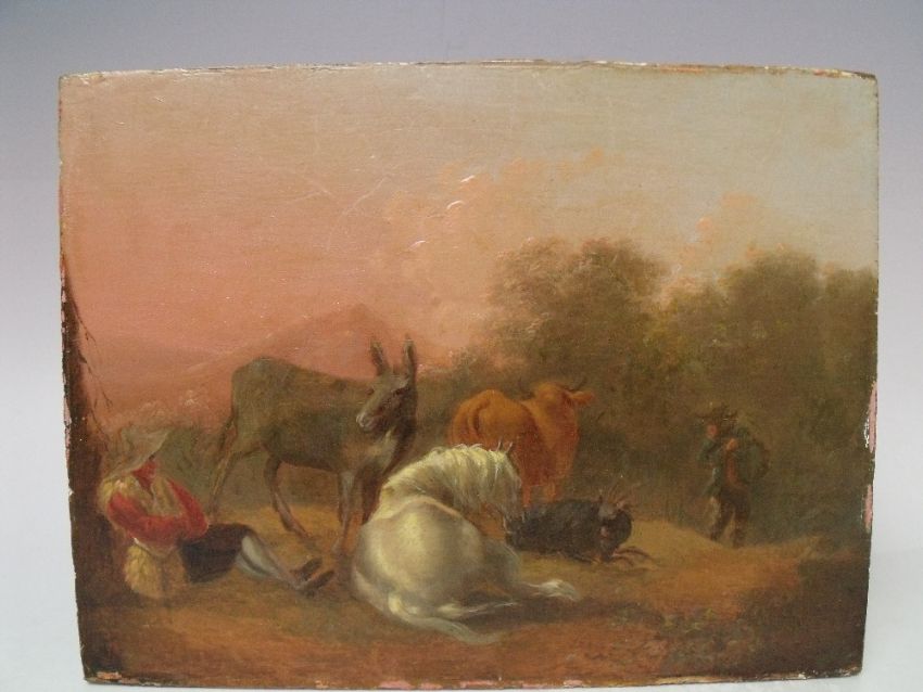 (XVIII-XIX). Dutch school, wooded mountainous landscape with figures and animals, indistinct label verso, unsigned, oil on panel unframed, 17 x 22 cm