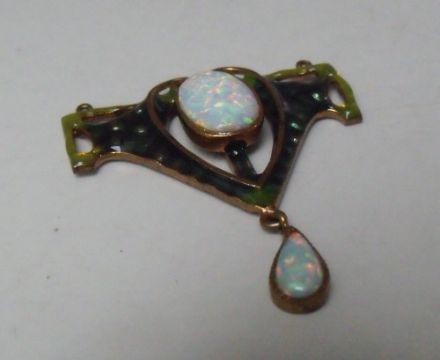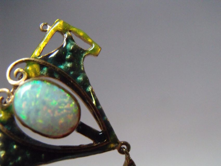 AN ARTS AND CRAFTS COPPER AND ENAMEL PENDANT, set with central oval opal and opal dropper, H 4.2 cm. lacking chain