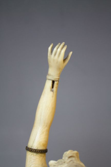 Condition Report:Splits to feet, minor losses to fingers on right hand, split to wrist on left hand, general discolouration throughout