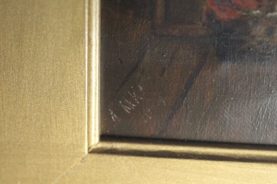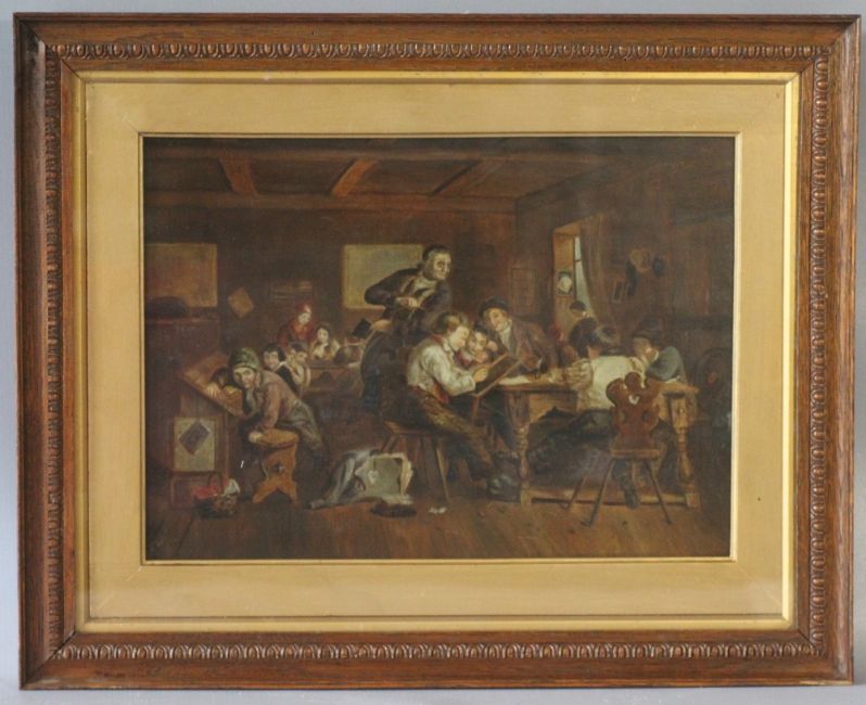 A.M.K. (XIX). Classroom interior with teacher and numerous pupils, signed with initials lower left, oil on canvas, framed and glazed, 26 x 36 cm