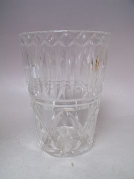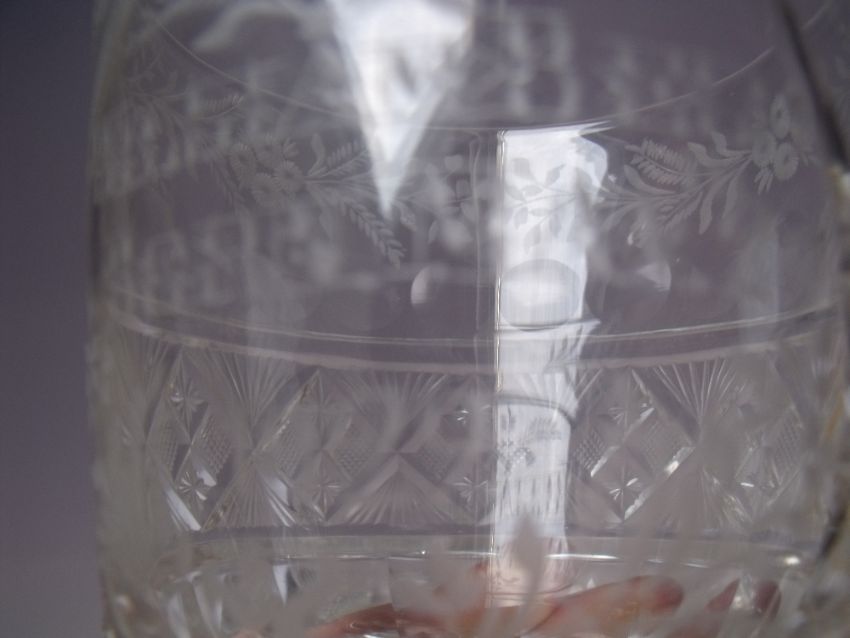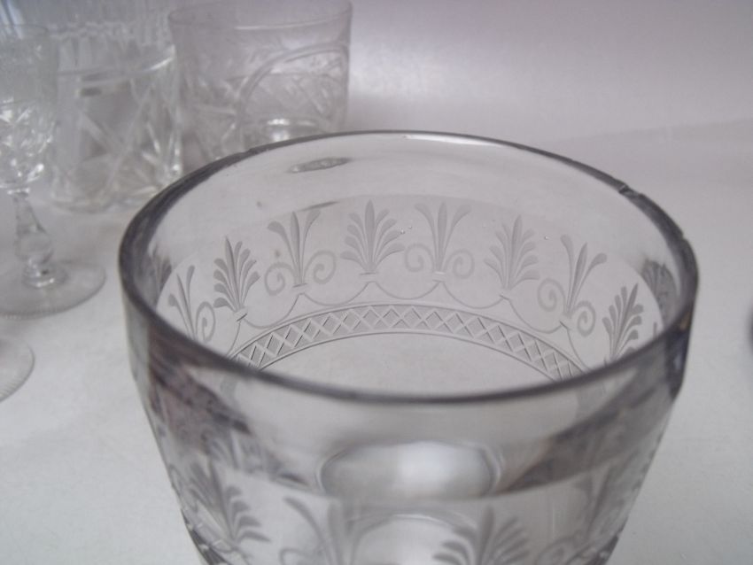 TWO ANTIQUE GLASS TUMBLERS, one with engraved dedication 'William Bell Born 29th 1829', together with a Webb Corbett cut glass vase, lidded box, etc.