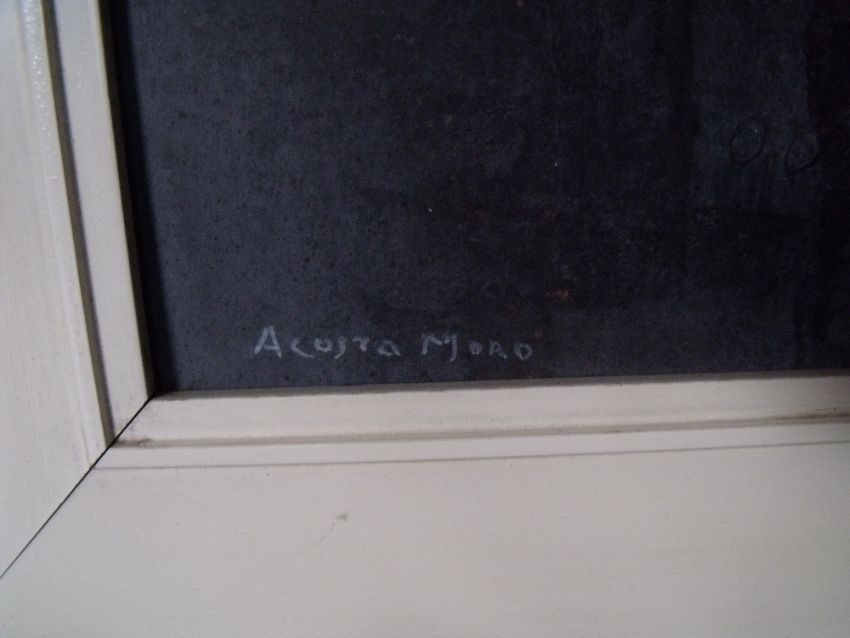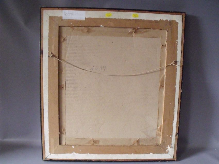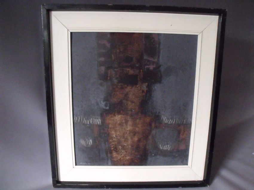 ASCOTA MORO (XX). Continental school, abstract composition with numerous figures 'Gloria in Excelsis', see verso, signed lower left, mixed media on board, framed, 47 x 41 cm