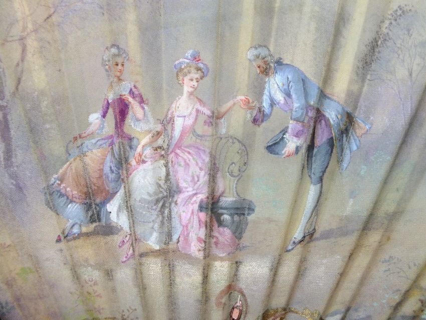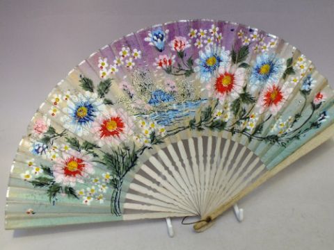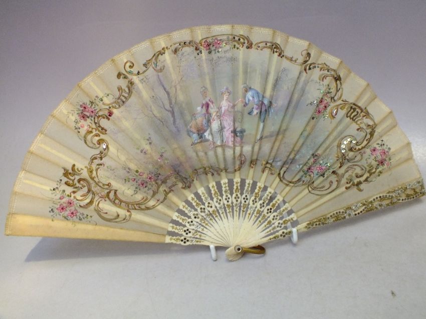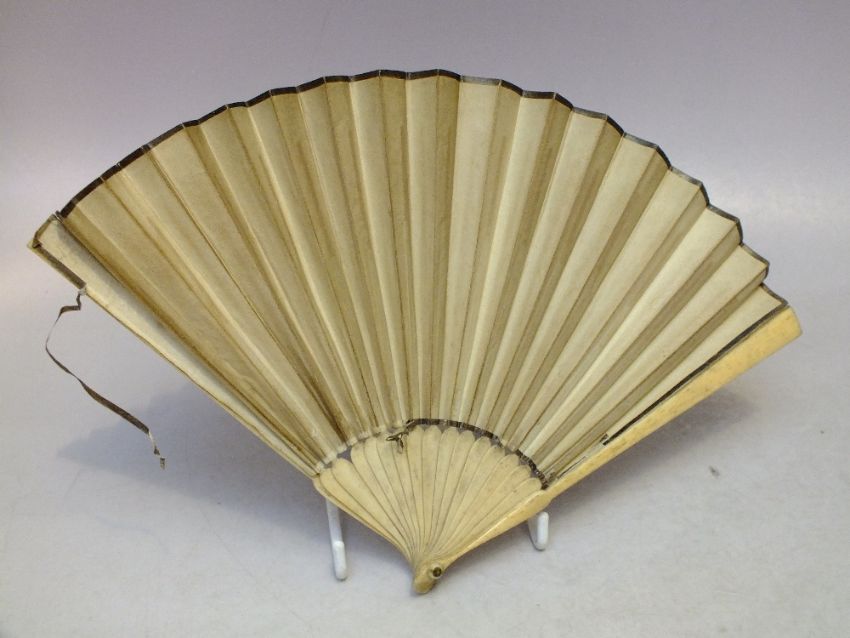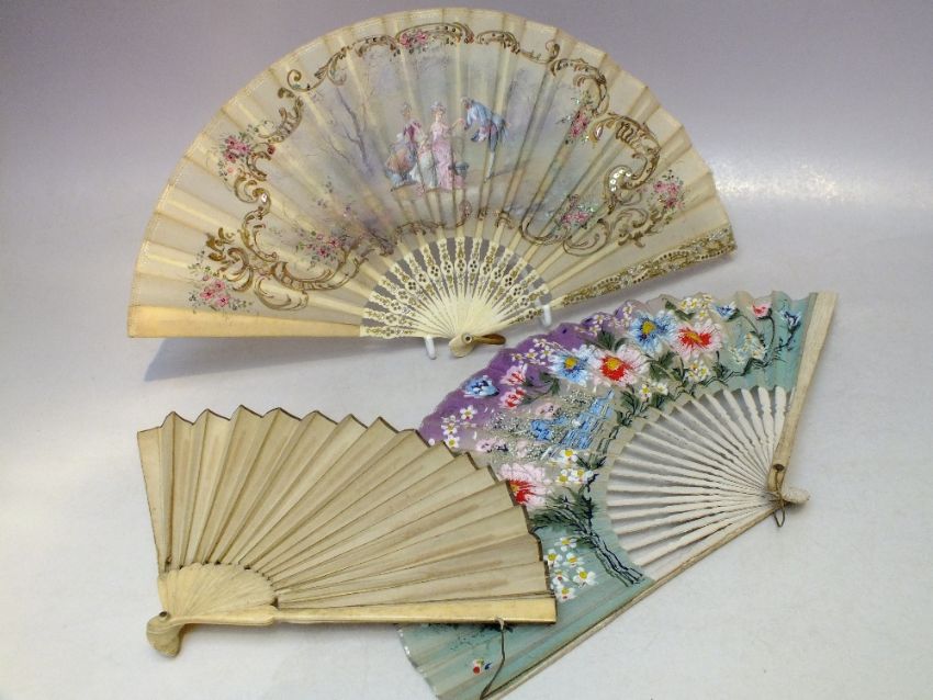 AN ANTIQUE CARVED BONE / IVORY HAND PAINTED FOLDING FAN, L 19 cm, together with a smaller plain folding fan and a small hand painted wooden folding fan (3)