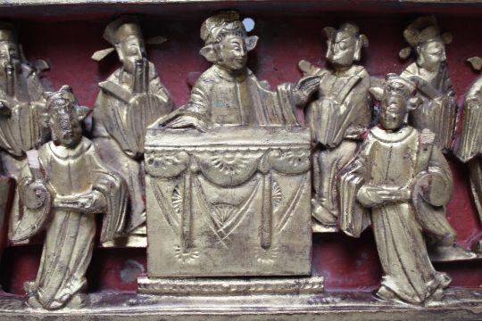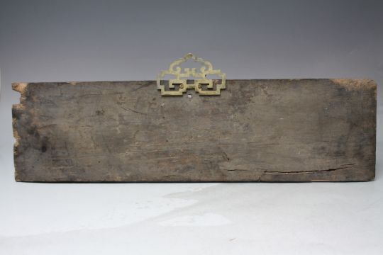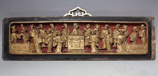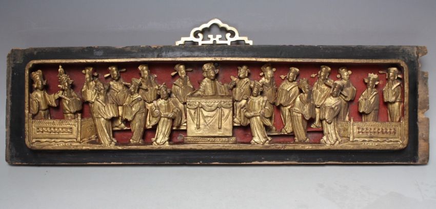 AN ORIENTAL CARVED AND GILT WOOD RECTANGULAR PANEL, modelled as figures carved in relief around a central figure, later gilt metal bracket, 15.5 x 55 cm