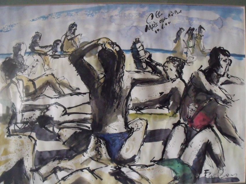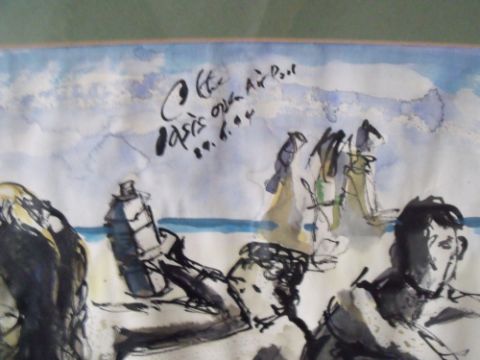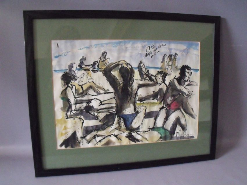 FAT BOY (XX). English school, impressionist beach scene with figures, signed lower right, mixed media on paper, framed and glazed, 28 x 40 cm