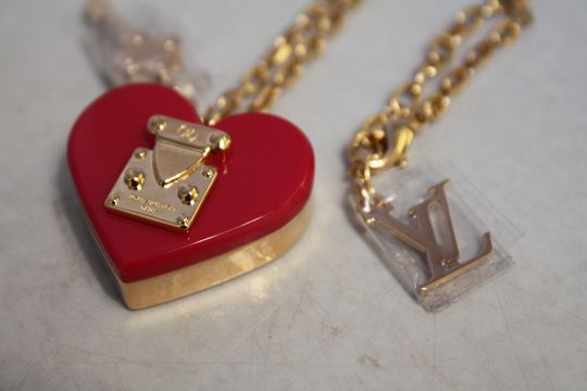 LOUIS VUITTON - A RESIN 'LOCK ME' HEART PENDANT NECKLACE, pendant drop 2.5 cm, chain L 55 cm, with some original plastic protective cover and a Louis Vuitton drawstring bag