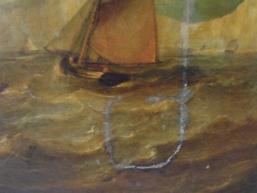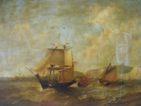 (XIX). Stormy coastal scene with sailing vessels and figures in a medium swell, cliffs in background, unsigned, oil on canvas, framed in gold slip, 70 x 90 cm